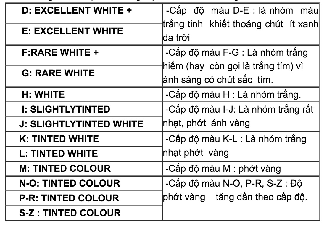 Theo tiêu chuẩn thế giới , màu sắc của Kim Cương được sắp theo bảng Alphabet