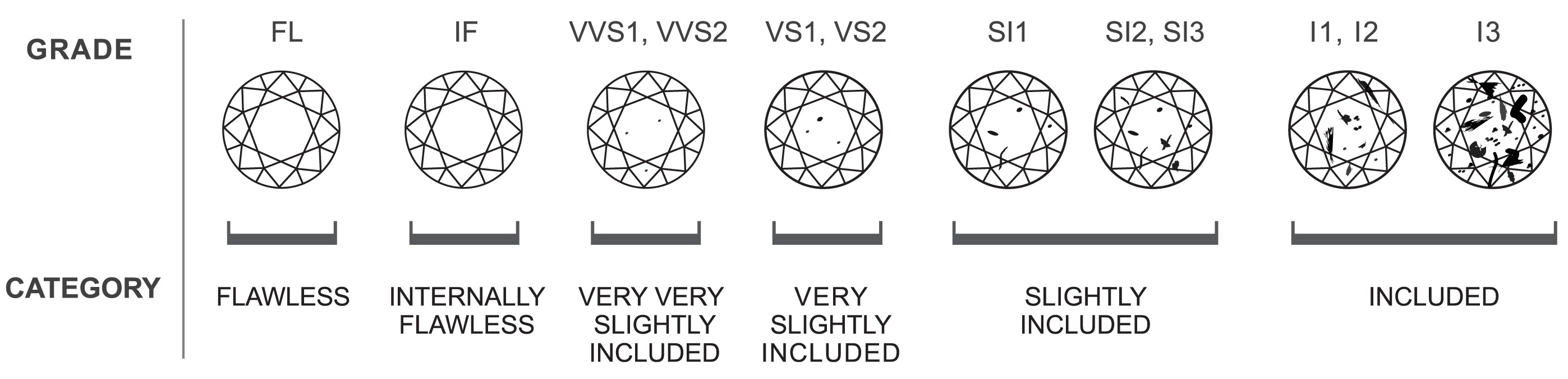 Độ tinh khiết giảm dần theo biểu đồ phân loại và giá trị cũng sẽ giảm 5% theo mỗi cấp độ liền kề nhau. Trường hợp Kim Cương bị xử lý để che sự khiếm khuyết . Ví dụ : Viên Kim Cương có độ tinh khiết la I3 nhưng sau đó người taa dùng tia laser khoan  đi và bơm thủy tinh vào để tạo độ tinh khiết như IF  thì vẫn không được xem như là IF , và  trong quá trình kiểm định vẫn được sấp xếp vào nhóm I3 như bản chất nguyên thủy.